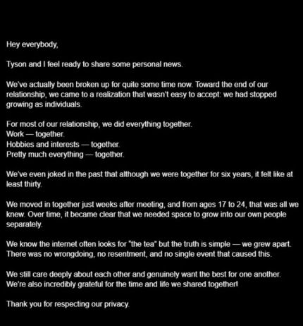 “We know the internet often looks for ‘the tea’ but the truth is simple– we grew apart. There was no wrongdoing, no resentment, and no single event that caused this,” ani Kyedae.