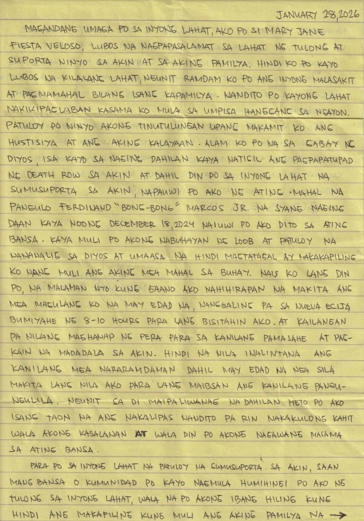 “Magandang umaga po sa inyong lahat, ako po si Mary Jane Fiesta Veloso, lubos na nagpapasalamat sa lahat ng tulong at suporta ninyo sa akin at sa aking pamilya,” ani Veloso.
