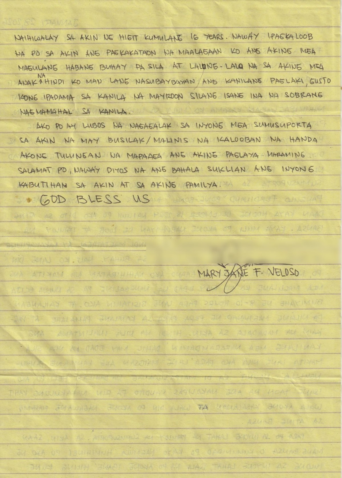 Sa nasabi pang liham, humihingi ng tulong si Veloso na siya ay mapagbigyang makapiling na ang kaniyang pamilya na aniya, nawalay sa kaniya sa humigit-kumulang 16 na taon.
