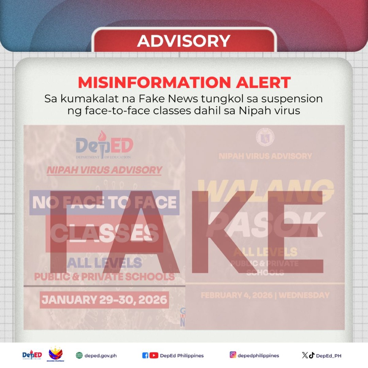 Pinasinungalingan ng Department of Education (DepEd) ang mga umano’y kumakalat na mga anunsyong suspensyon ng mga klase dahil sa Nipah virus.