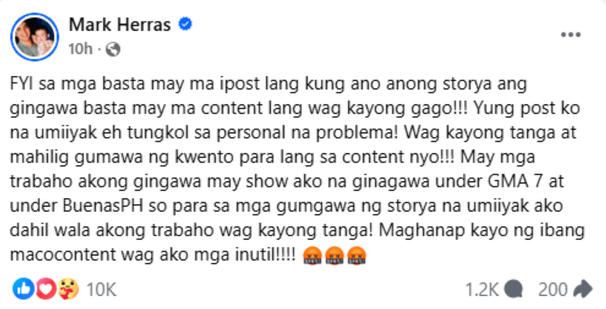 Naglabas ng matapang at direktang pahayag sa Facebook ang aktor na si Mark Herras kaugnay ng viral video kung saan makikitang umiiyak siya—isang video na, ayon sa kaniya, ay maling binigyan ng kuwento ng ilang netizens at content creators.