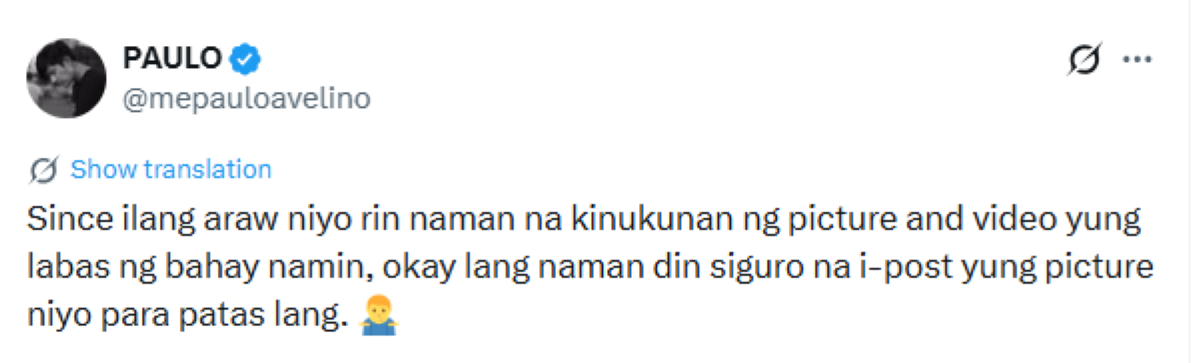 Mababasa sa post ni Paulo, "Since ilang araw niyo rin naman na kinukunan ng picture and video yung labas ng bahay namin, okay lang naman din siguro na i-post yung picture niyo para patas lang."