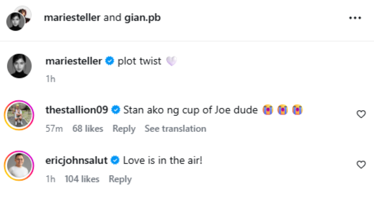 "Plot twist," mababasang caption ng post, na may emoji na white heart. Naka-tag ang post niya sa Instagram post ni Gian.