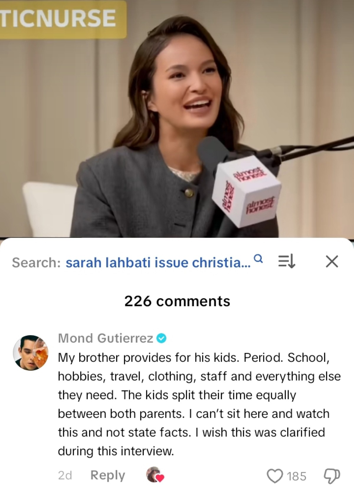 Sa comment section ng isang TikTok video, nagkomento naman ang twin brother ni Richard, na bagama't hindi naman binanggit ang pangalan ng estranged husband ni Sarah, ay tila na-"connect the dot" ni Mond na puwede umanong pumatungkol sa kapatid.