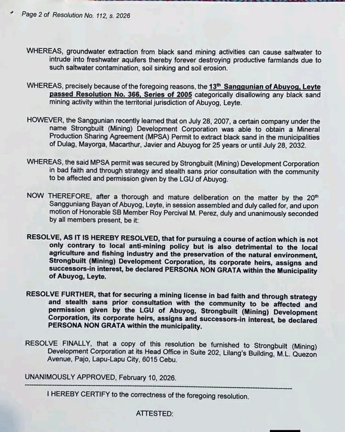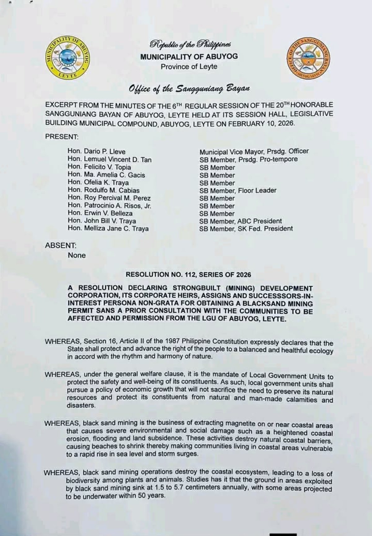 Nagtakda ang sangguniang bayan ng Abuyog, Leyte ng isang resolusyong nagdedeklara sa corporate heirs, assigns, at successors-in-interest ng kompanyang Strongbuilt (Mining) Development Corporation bilang “persona non grata” sa kanilang munisipalidad.