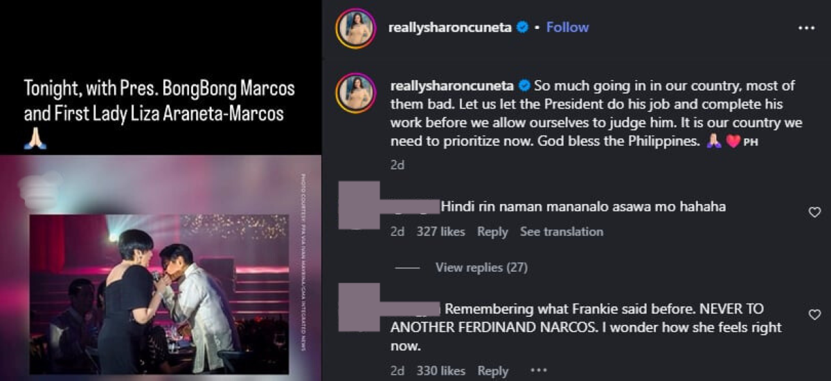 Ayon sa ibinahaging IG post ni Sharon kamakailan, tahasan niyang sinabi na hayaan daw munang magtrabaho si PBBM bago ito pukulin ng mga panghuhusga.
