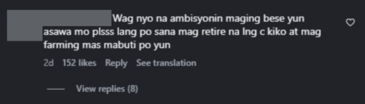 “Wag nyo na ambisyonin maging bese yun asawa mo plsss lang po sana mag retire na lng c kiko at mag farming mas mabuti po yun”