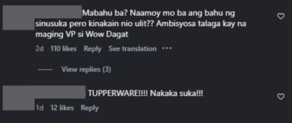 “Mabahu ba? Naamoy mo ba ang bahu ng sinusuka pero kinakain nio ulit?? Ambisyosa talaga kay na maging VP si Wow Dagat”
