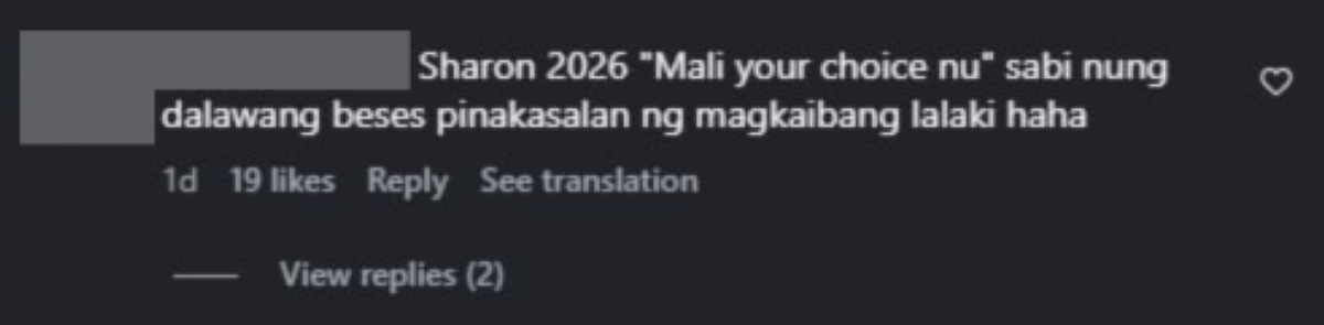 “Sharon 2026 "Mali your choice nu" sabi nung dalawang beses pinakasalan ng magkaibang lalaki haha”