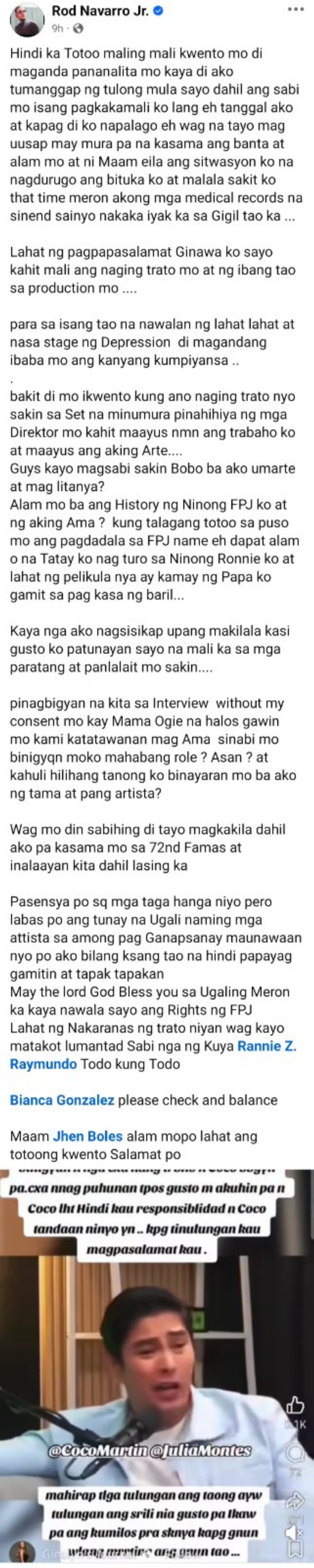 Naglabas ng hinanakit ang aktor na si Rod Navarro, Jr. sa aniya’y maling trato umano sa kaniya ni Kapamilya Primetime King Coco Martin at ng iba pang tao sa production nito.