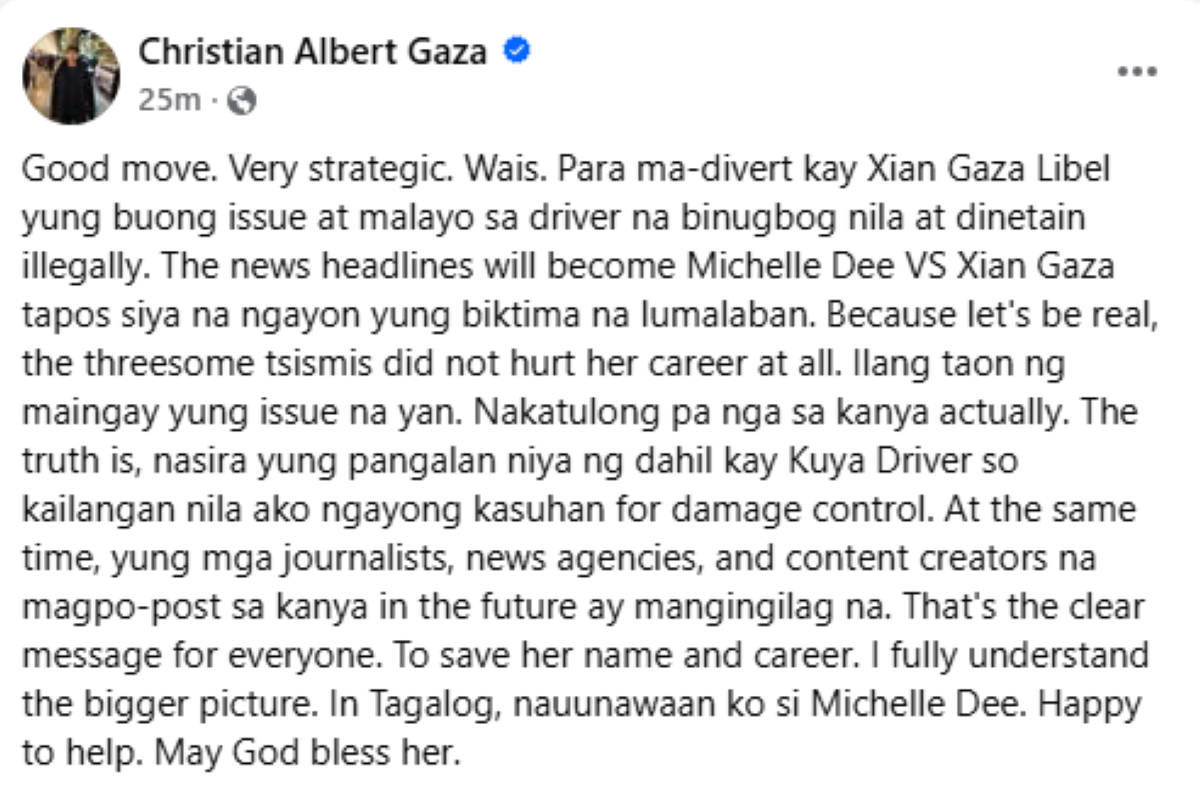 Sa isa pang Facebook post, pinaratangan ni Xian si Michelle na ang reklamong ito ay tila pang-divert sa isyu ng aktres sa inirereklamo at nagreklamong driver laban sa kaniya.