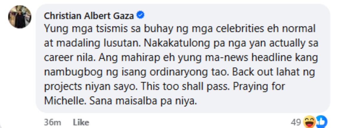 Dagdag pa ni Xian, "Yung mga tsismis sa buhay ng mga celebrities eh normal at madaling lusutan. Nakakatulong pa nga yan actually sa career nila. Ang mahirap eh yung ma-news headline kang nambugbog ng isang ordinaryong tao. Back out lahat ng projects niyan sayo. This too shall pass. Praying for Michelle. Sana maisalba pa niya."