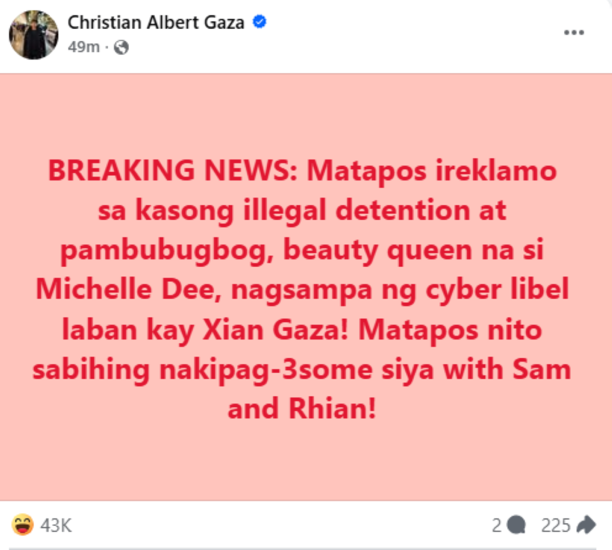 Samantala, mababasa naman sa post ni Xian, "BREAKING NEWS: Matapos ireklamo sa kasong illegal detention at pambubugbog, beauty queen na si Michelle Dee, nagsampa ng cyber libel laban kay Xian Gaza! Matapos nito sabihing nakipag-3some siya with Sam and Rhian!"