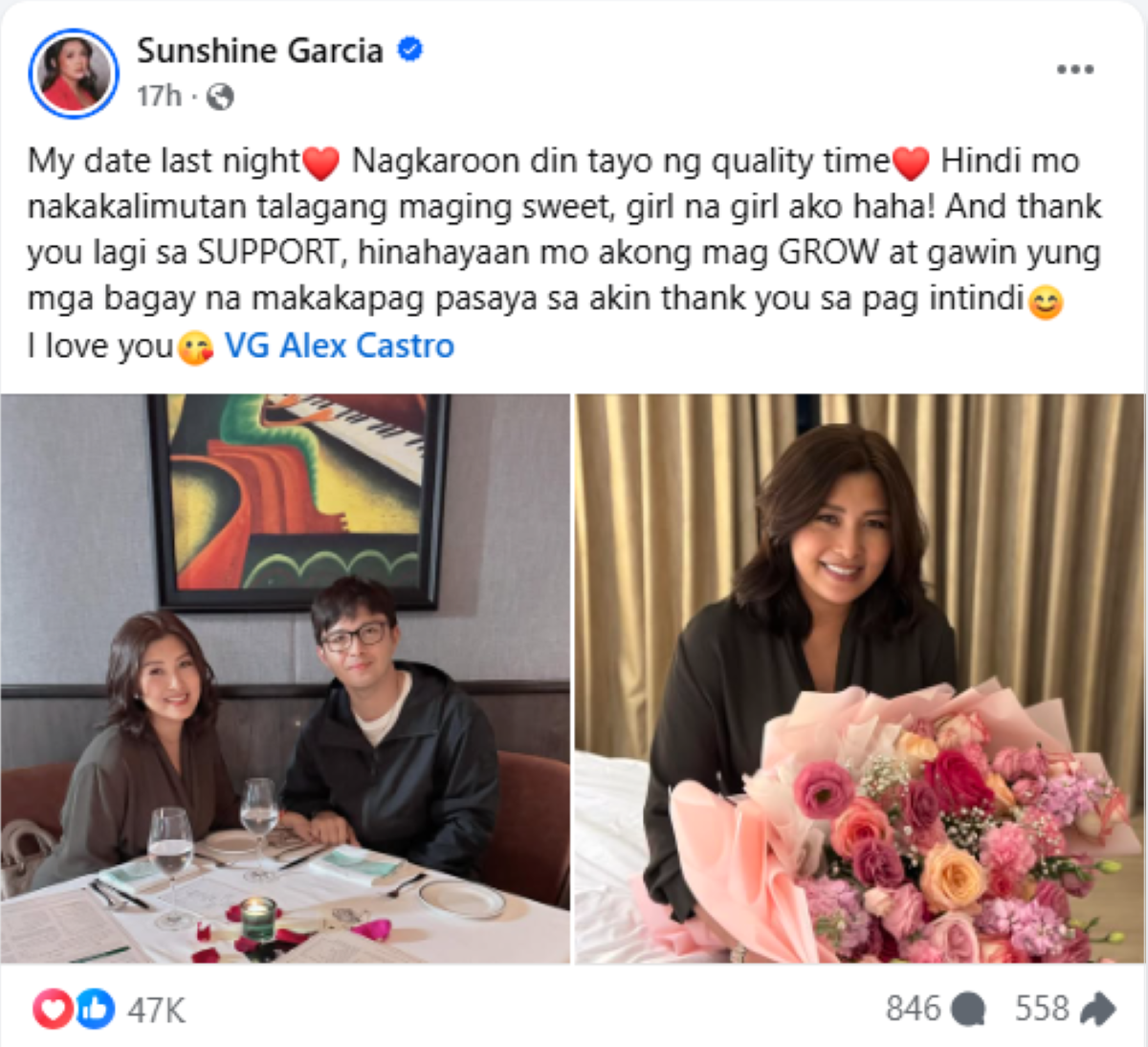 Ayon sa Facebook post ni Sunshine noong Linggo, Pebrero 15, pinasalamatan ni Sunshine si Alex dahil bukod sa date night nila para ipagdiwang ang Araw ng mga Puso, sinusuportahan daw siya nito para lumago at gawin ang mga bagay na magpapasaya sa kaniya.