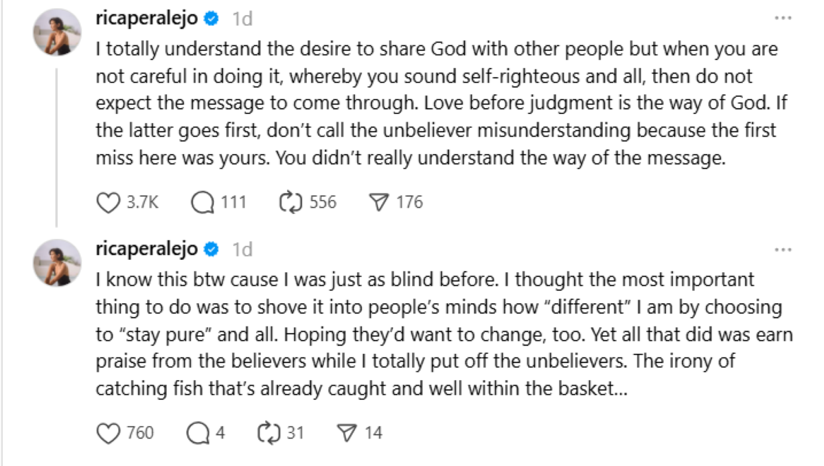 Mababasa sa threads post ni Rica noong Lunes, Pebrero 16, na ibinahagi niyang naiintindihan niya ang kagustuhan ng marami magbahagi ng salita ng Diyos.