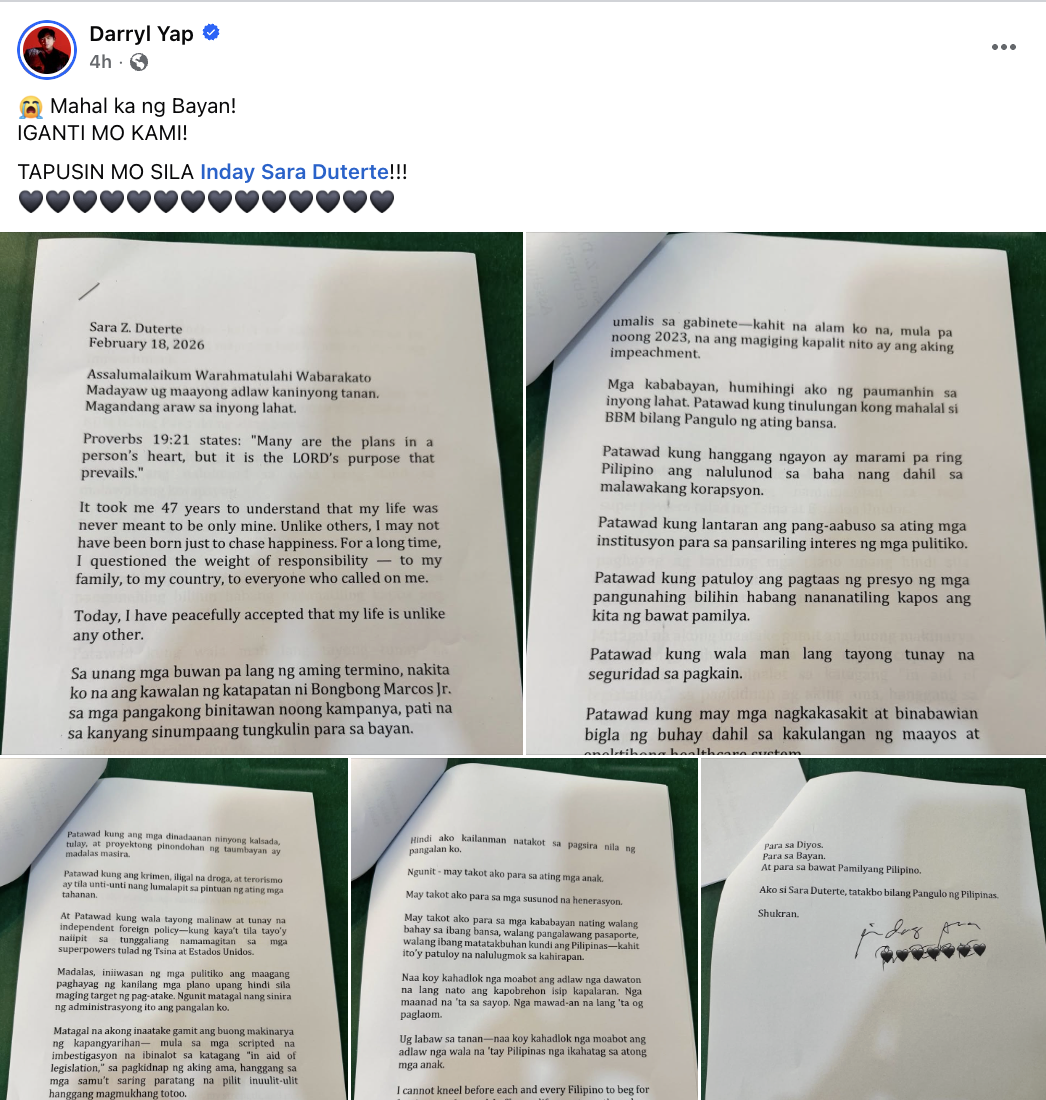 Samantala, sa isang Facebook post, naghayag ng suporta si Yap kay Duterte, kaakibat ang kopya ng talumpati ng bise presidente.