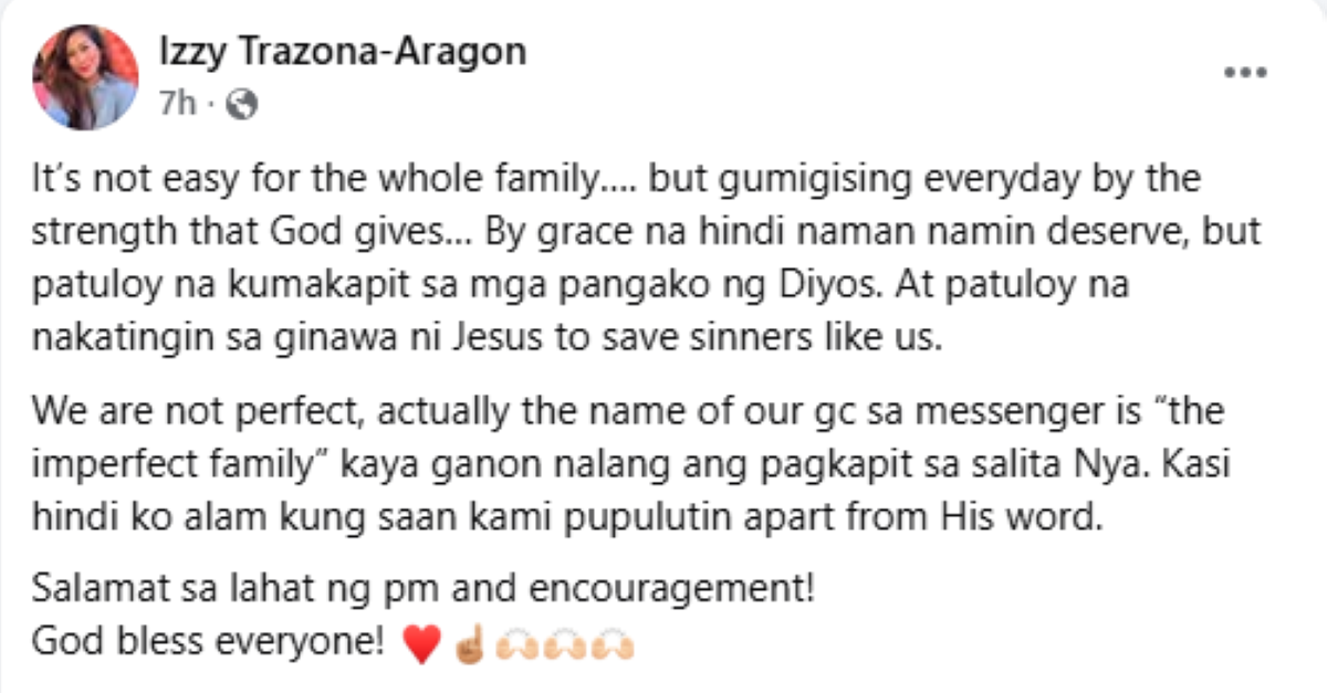 Sa kaniyang Facebook post nitong Miyerkules, Pebrero 18, inamin ni Izzy na hindi madali ang pinagdaraanan ng kanilang pamilya sa kasalukuyan.