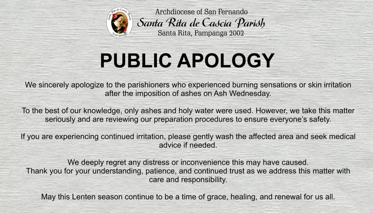 “We sincerely apologize to the parishioners who experienced burning sensations or skin irritation after the imposition of ashes on Ash Wednesday,” saad ng Santa Rita de Cascia Parish, Archdiocese of San Fernando, Pampanga sa kanilang pahayag nitong Huwebes, Pebrero 19.