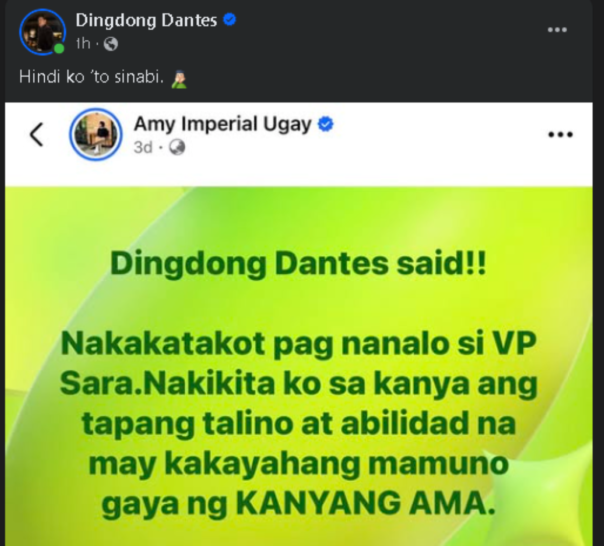 “Dingdong Dantes said, 'Nakakatakot 'pag nanalo si VP Sara. Nakikita ko sa kaniya ang tapang, talino, at abilidad na may kakayahang mamuno gaya ng kaniyang ama,'" mababasa sa post.