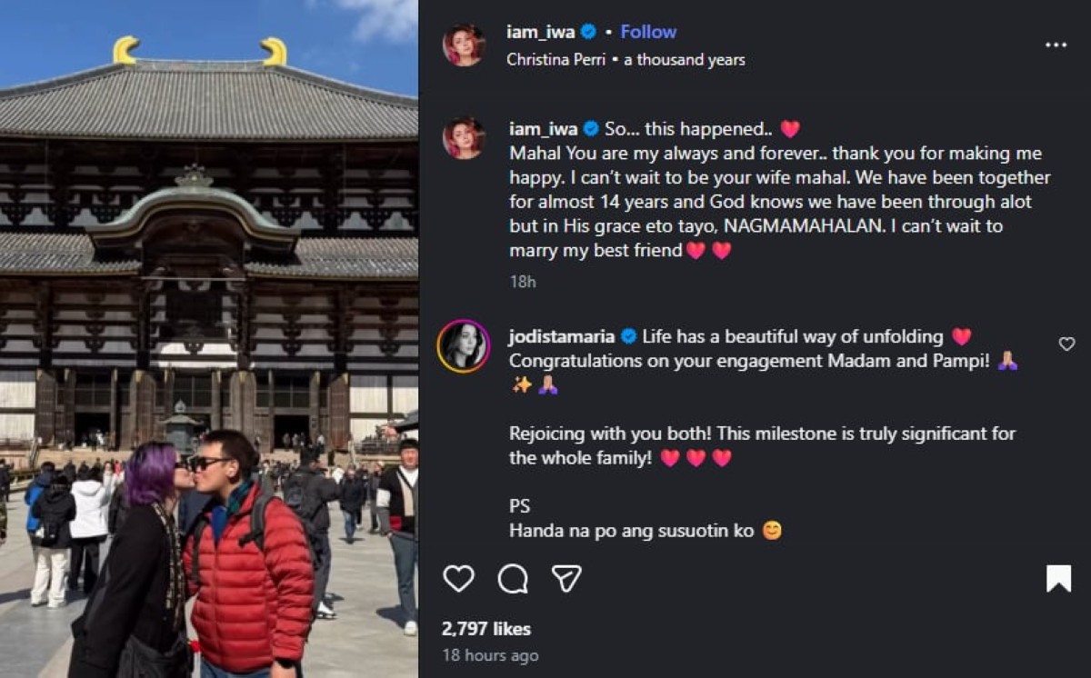 Kaugnay ito pagsasapubliko ni Iwa ng nasabing engagement nila ni Pampi, na naganap sa Nara, Osaka, Japan noong Miyerkules, Pebrero 18, matapos ang halos 14 taon nilang pagsasama.
