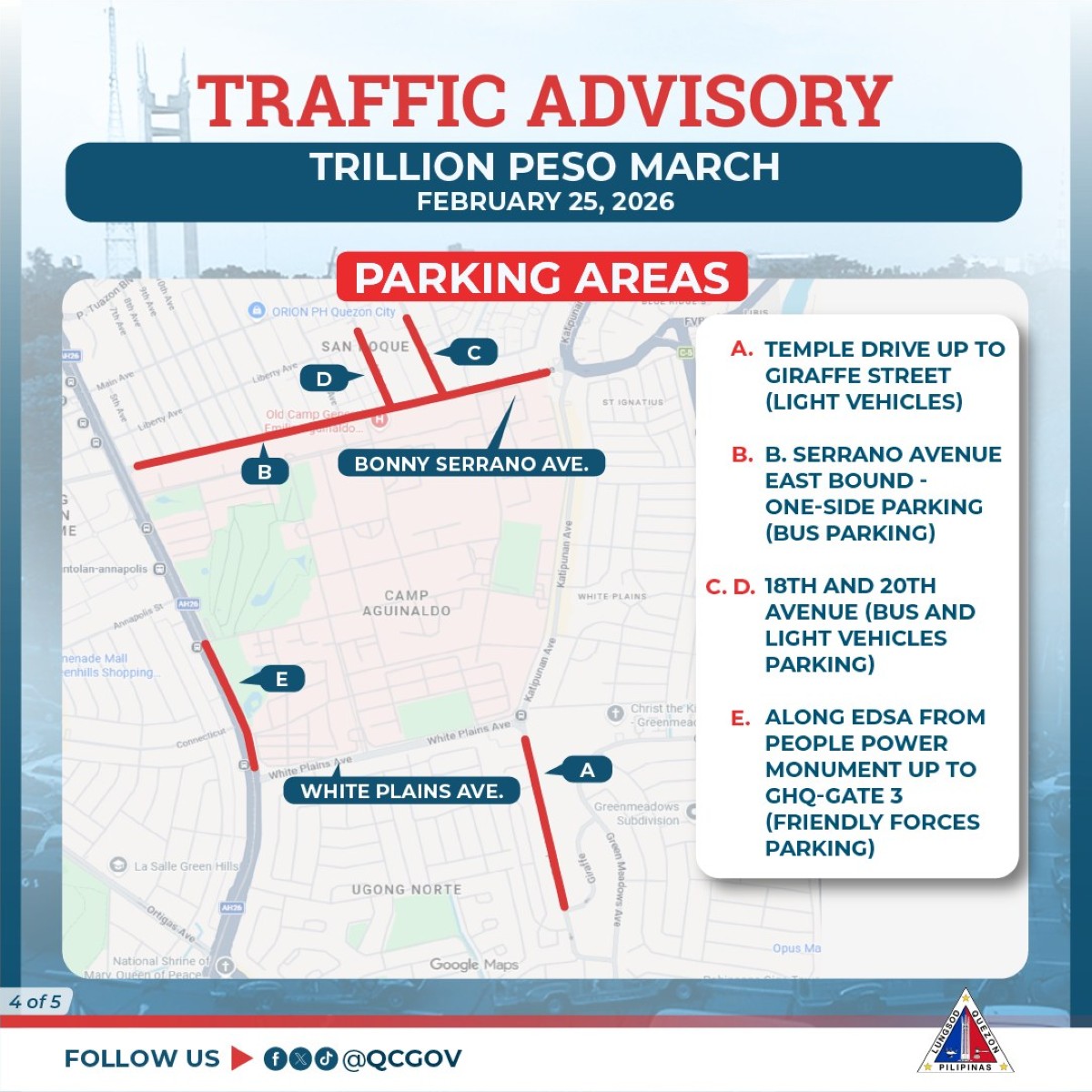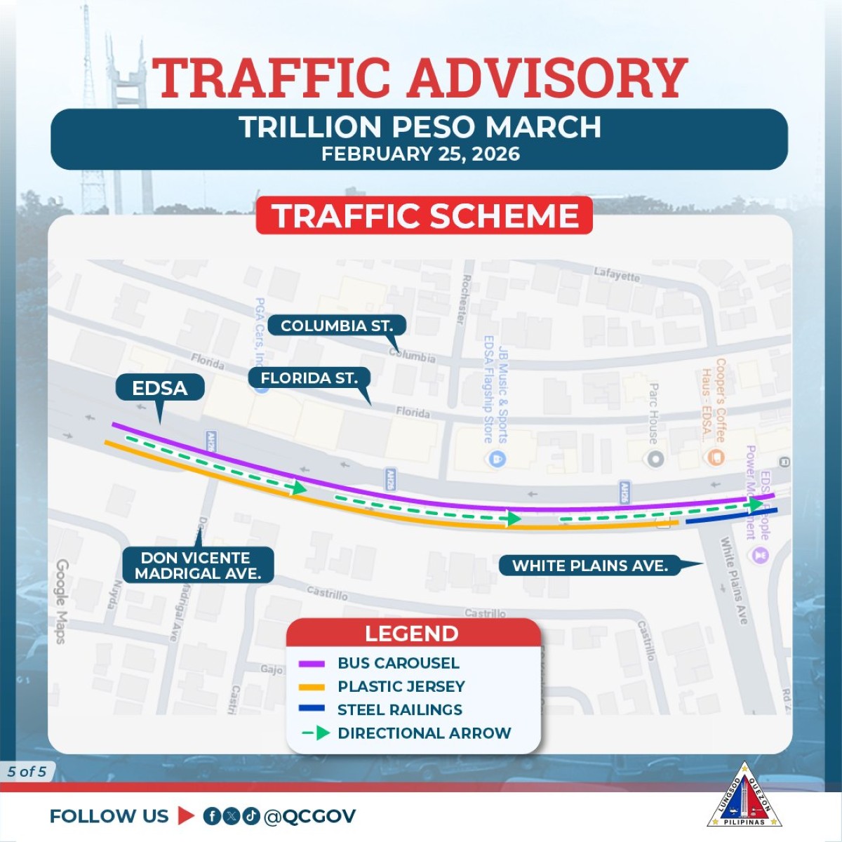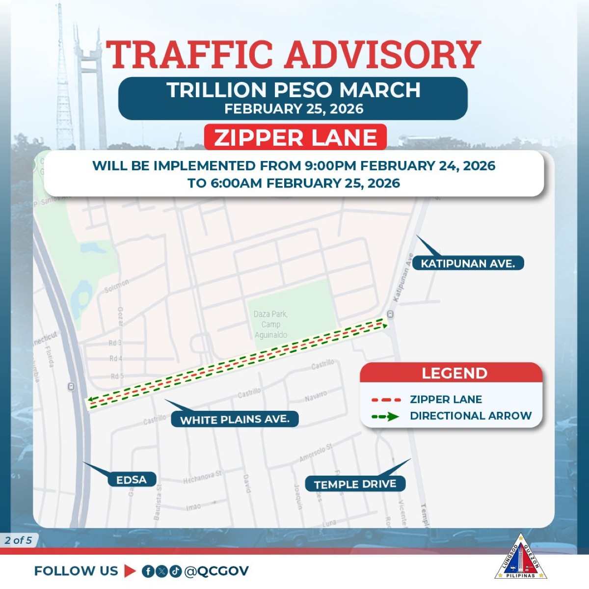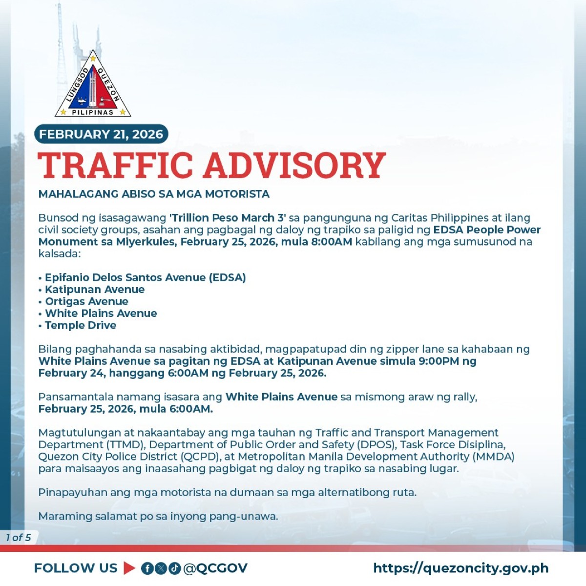 Inilabas na ng Quezon City local government (LGU) ang traffic advisory bilang paghahanda para sa darating na ikatlong Trillion Peso March sa Miyerkules, Pebrero 25.