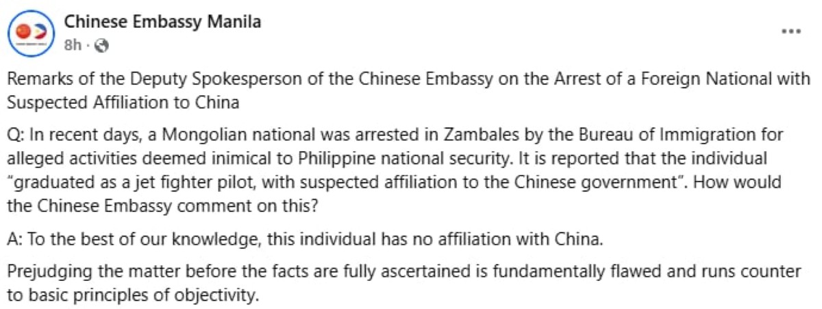 Itinanggi ng Chinese Embassy-Manila na may kaugnayan sa gobyerno ng bansang China ang naarestong Mongolian national ng Bureau of Immigration (BI) kamakailan.