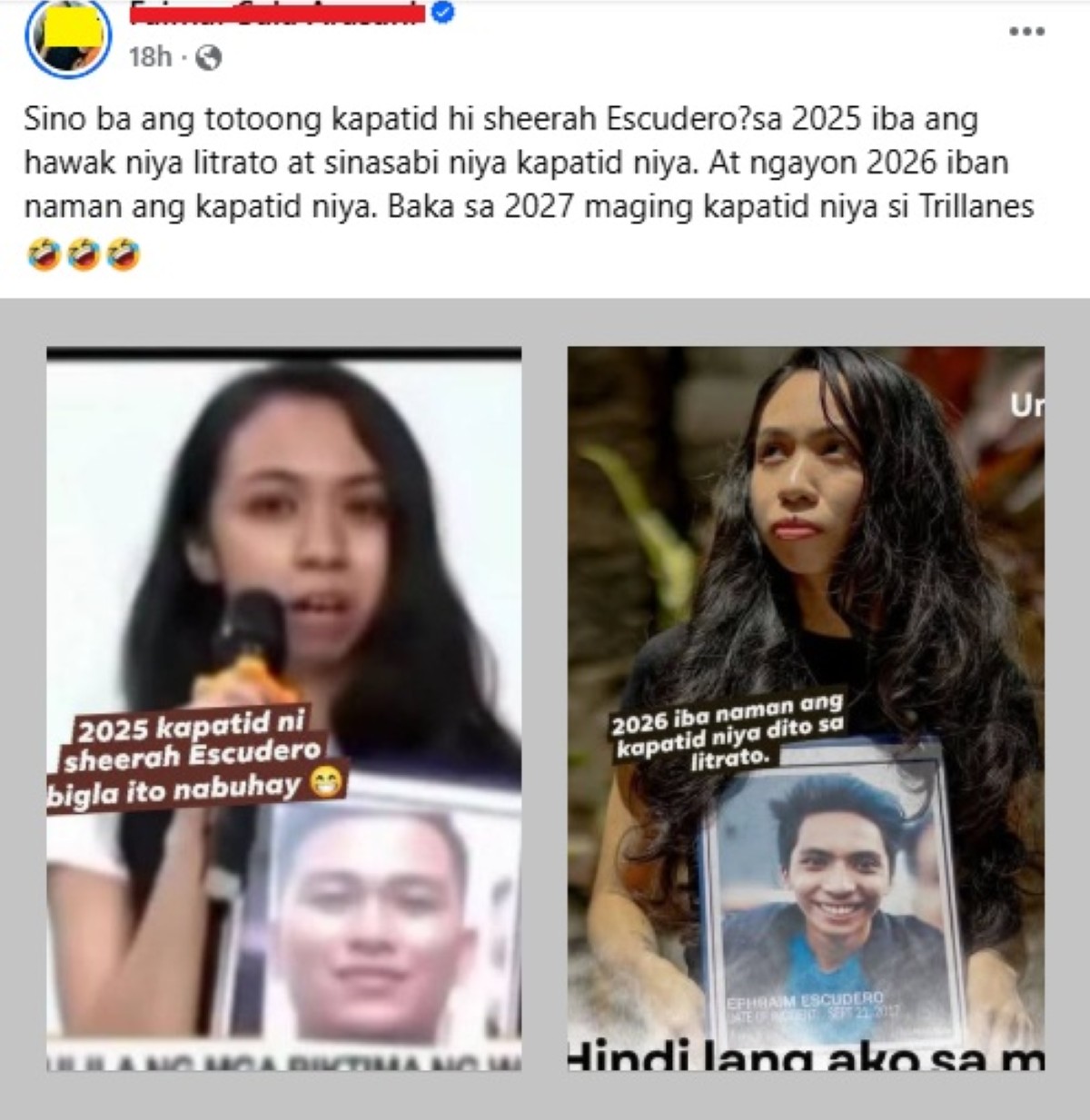 Mababasa sa post niya, "Sino ba ang totoong kapatid hi sheerah Escudero?sa 2025 iba ang hawak niya litrato at sinasabi niya kapatid niya. At ngayon 2026 iban naman ang kapatid niya. Baka sa 2027 maging kapatid niya si Trillanes."