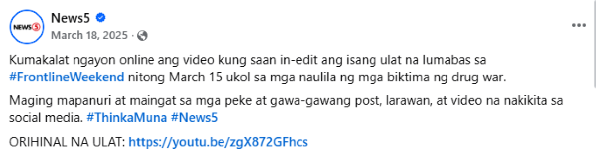 Mababasa sa kanilang anunsyo noong Marso 18, 2025, "Kumakalat ngayon online ang video kung saan in-edit ang isang ulat na lumabas sa #FrontlineWeekend nitong March 15 ukol sa mga naulila ng mga biktima ng drug war."