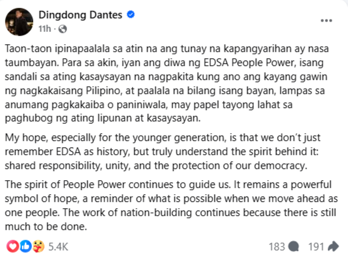 Dagdag pa niya, patuloy na gumagabay sa kasalukuyan ang diwa ng People Power bilang makapangyarihang simbolo ng pag-asa. Isa rin itong paalala na maraming bagay ang maaaring makamit kung kikilos ang mamamayan bilang iisang bayan.