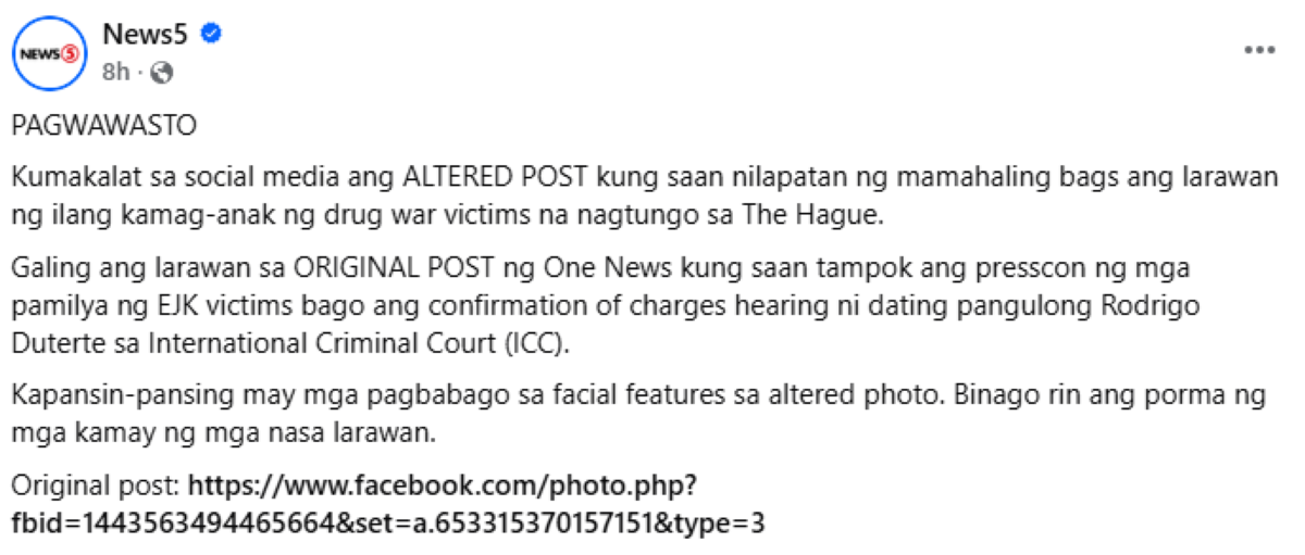 Paglilinaw naman ng News 5 nitong Miyerkules, Pebrero 25, "Kumakalat sa social media ang ALTERED POST kung saan nilapatan ng mamahaling bags ang larawan ng ilang kamag-anak ng drug war victims na nagtungo sa The Hague."