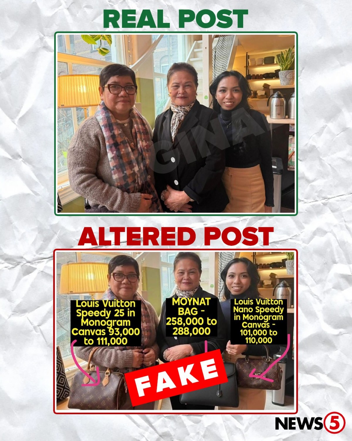 Samantala, kumalat naman ang isang altered photo kung saan inedit ang nabanggit na larawan, at nilagyan ng kunwari ay branded bags.