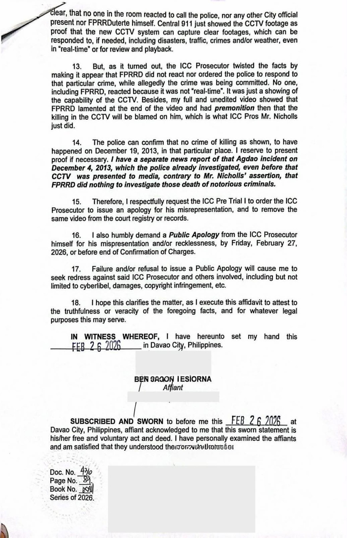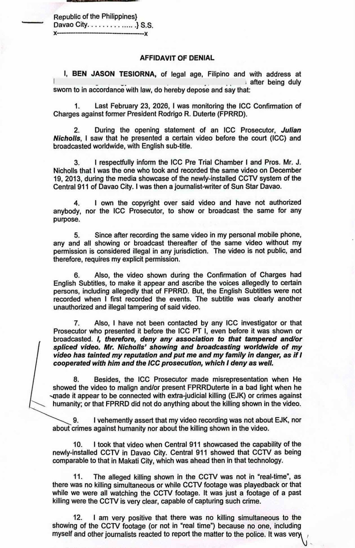Naghain ng Affidavit of Denial si Ben Jason Tesiorna, isang mamamahayag mula sa Davao City, kaugnay ng video na ipinakita ng isang prosecutor ng International Criminal Court (ICC) bilang ebidensya, sa pagdinig ng confirmation of charges laban kay dating Pangulong Rodrigo Duterte noong Lunes, Pebrero 23, 2026.