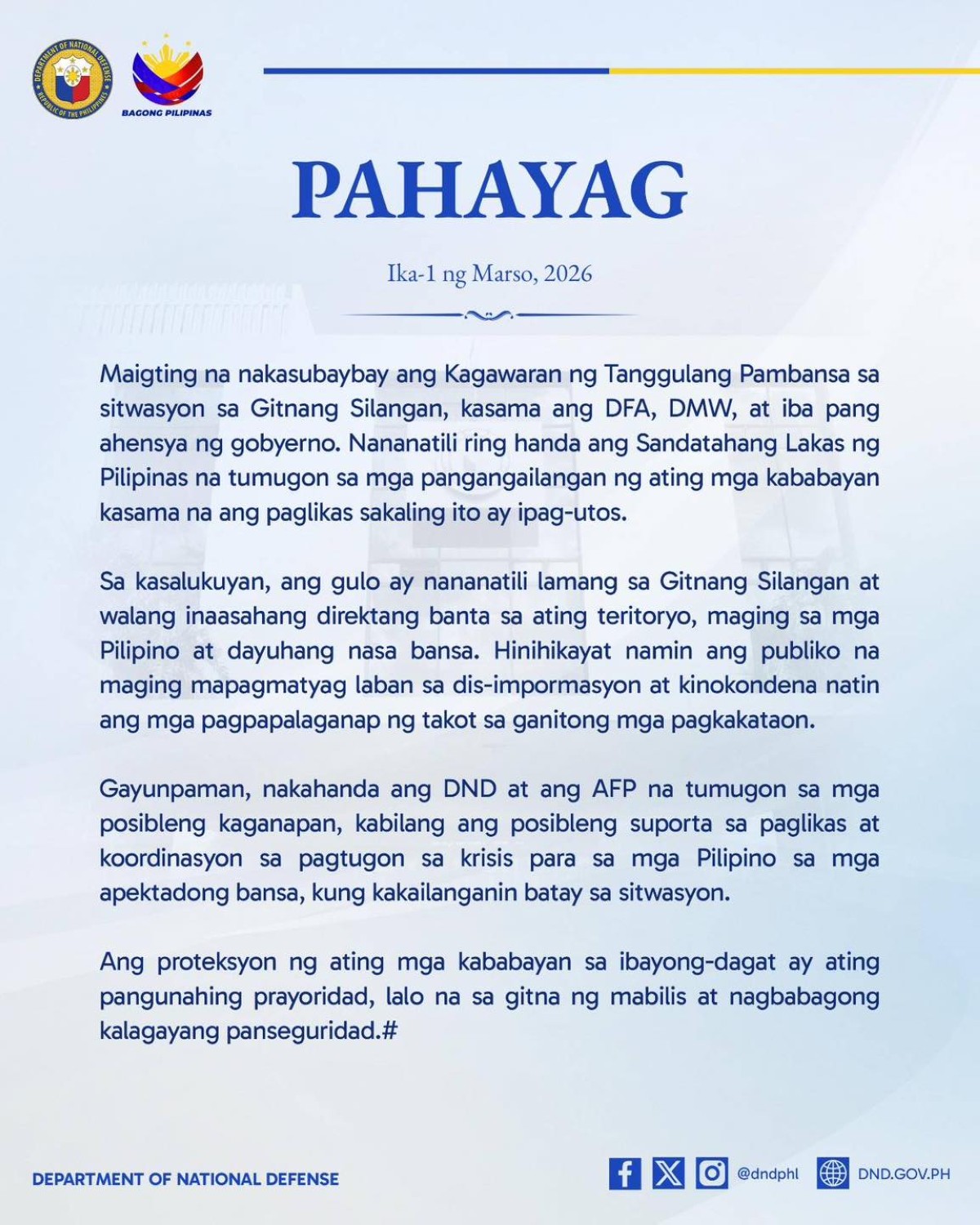 “Maigting na nakasubaybay ang Kagawaran ng Tanggulang Pambansa sa sitwasyon sa Gitnang Silangan, kasama ang DFA, DMW, at iba pang ahensya ng gobyerno,” saad ng DND.