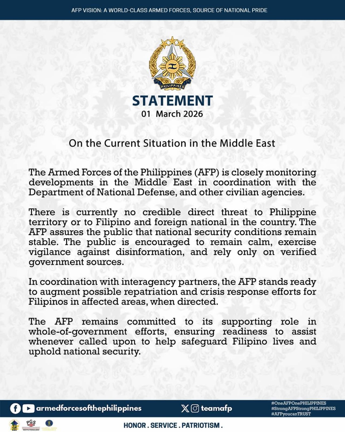 “There is currently no credible direct threat to Philippine territory or to Filipino and foreign national in the country. The AFP assures the public that national security conditions remain stable. The public is encouraged to remain calm, exercise vigilance against disinformation, and rely only on verified government sources,” saad ng AFP.