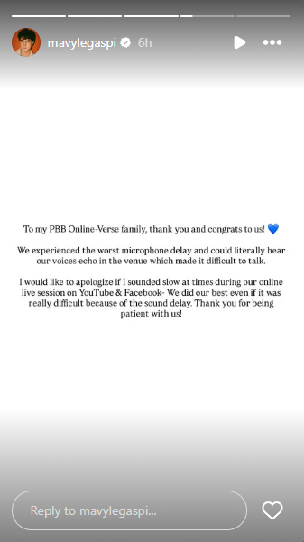 Sa kaniyang Instagram Story, inamin ni Mavy na nagkaroon ng teknikal na aberya sa program flow, partikular ang matinding microphone delay na nakaapekto sa kanilang pagsasalita sa entablado.