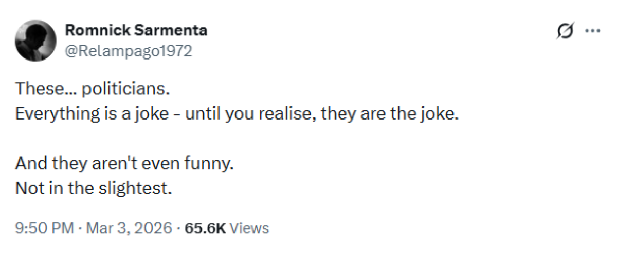 Sa kaniyang post noong gabi ng Martes, binanatan ni Romnick ang mga politiko patungkol sa mga "joke."