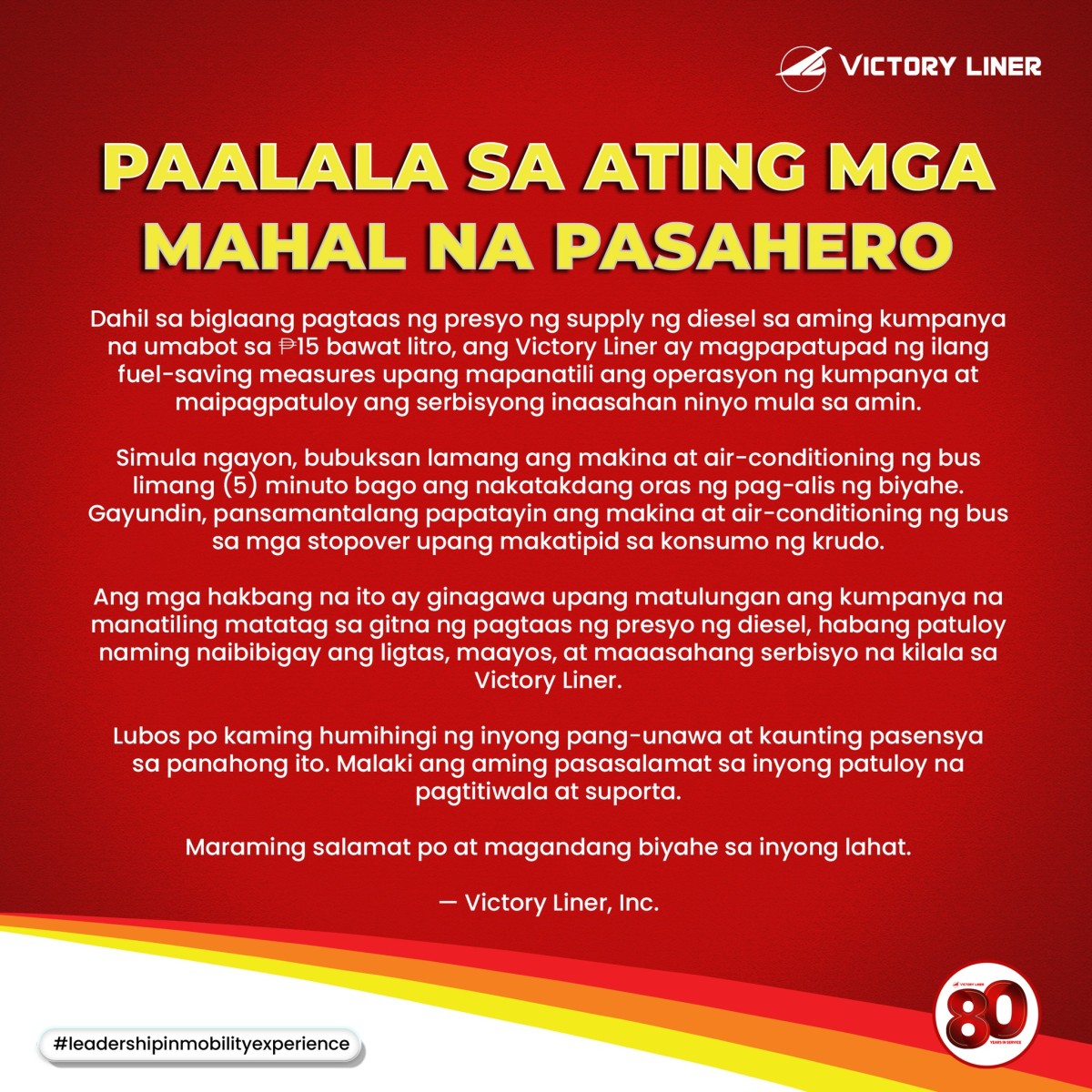 “Dahil sa biglaang pagtaas ng presyo ng supply ng diesel sa aming kumpanya na umabot sa ₱15 bawat litro, ang Victory Liner ay magpapatupad ng ilang fuel-saving measures upang mapanatili ang operasyon ng kumpanya at maipagpatuloy ang serbisyong inaasahan ninyo mula sa amin,” panimula ng Victory Liner.