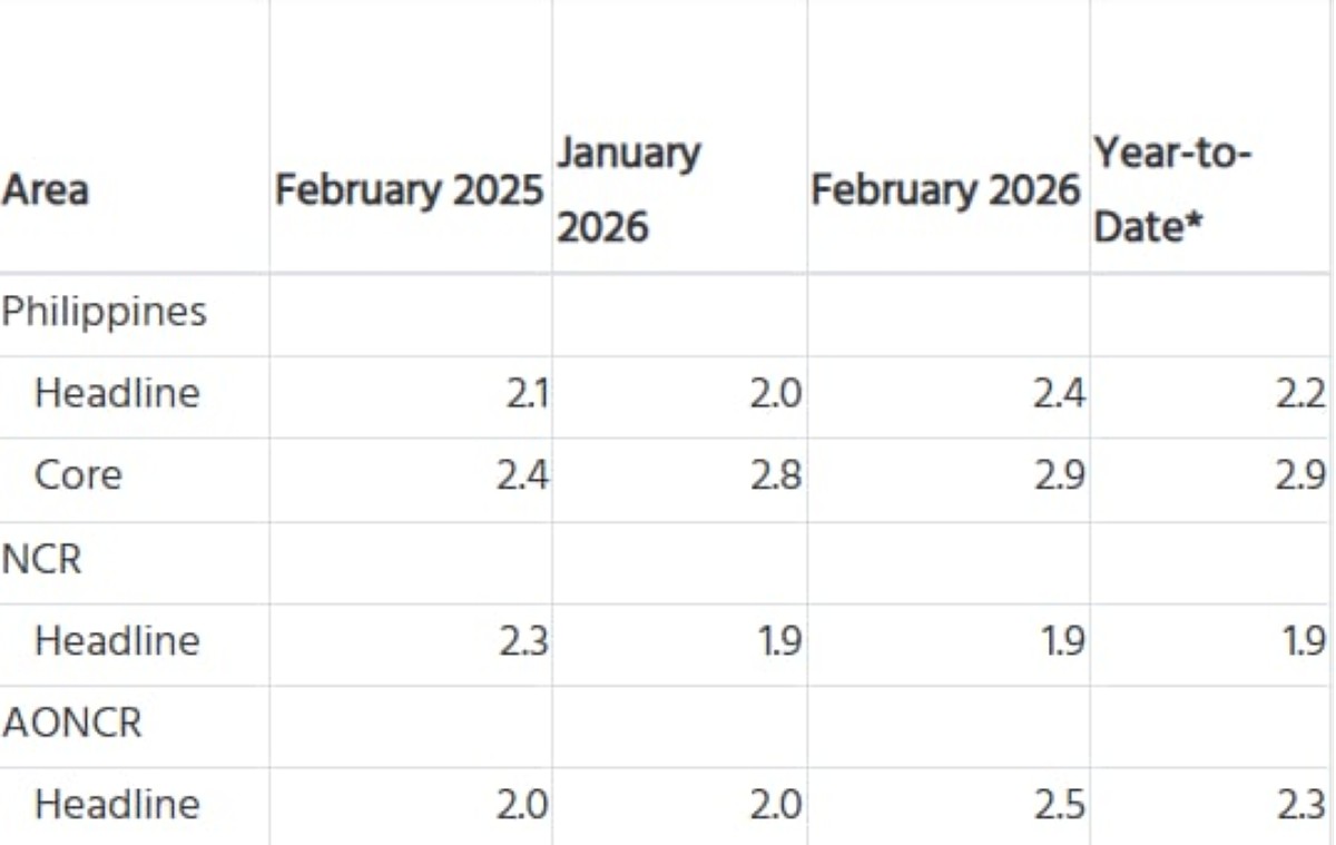 “The Philippines’ headline inflation or overall inflation increased to 2.4 percent in February 2026 from 2.0 percent in January 2026. In February 2025, the inflation rate was observed at 2.1 percent,” ani PSA sa kanilang Facebook post nito ring Huwebes, Marso 5.