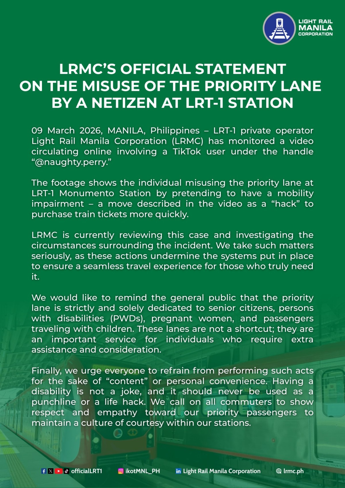 “We urge everyone to refrain from performing such acts for the sake of ‘content’ or personal convenience. Having a disability is not a joke, and it should never be used as a punchline or a life hack. We call on all commuters to show respect and empathy toward our priority passengers to maintain a culture of courtesy within our stations,” panawagan ng LRMC.