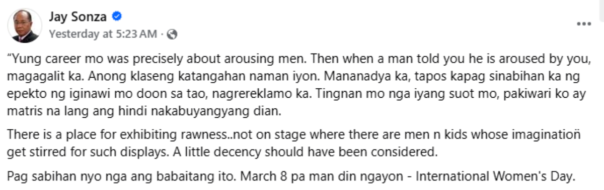 "Clothing may attract attention, but it should never justify disrespect. Actresses sometimes wear swimsuits or revealing outfits as part of their profession, just like athletes wear uniforms for their sport. That doesn’t make them objects for men’s imagination or degrading comments. Respect should never depend on what a woman is wearing. IKAW ANG DAPAT PAGSABIHAN. KAPAG BASTOS KA, BASTOS KA."