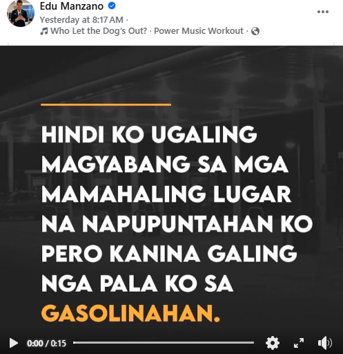 "Hindi ko ugaling magyabang sa mga mamahaling lugar na napupuntahan ko pero kanina galing nga pala ako sa gasolinahan," aniya.
