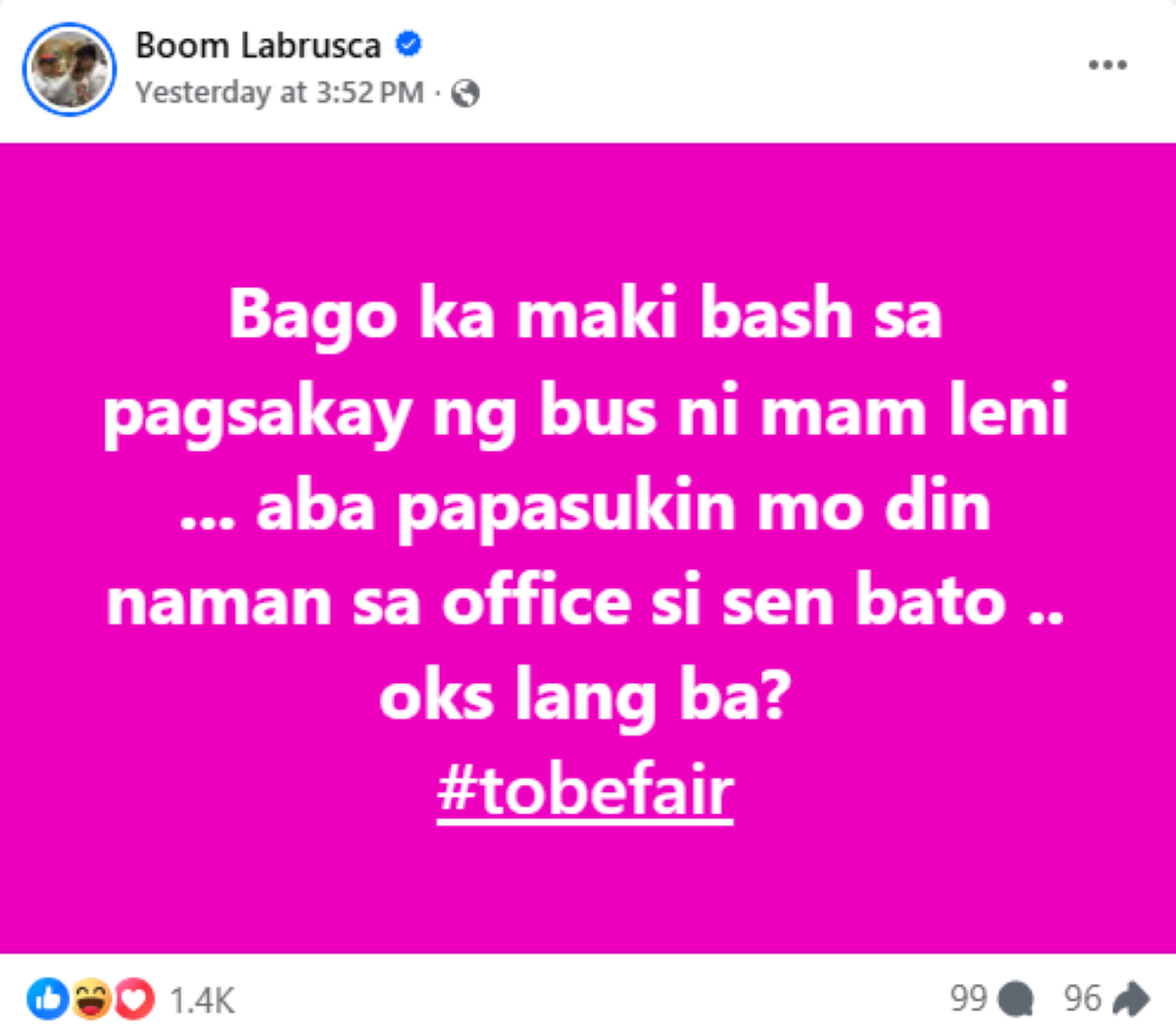 Saad pa niya, "Bago ka maki bash sa pagsakay ng bus ni mam leni ... aba papasukin mo din naman sa office si sen bato .. oks lang ba?" na may hashtag na #tobefair."