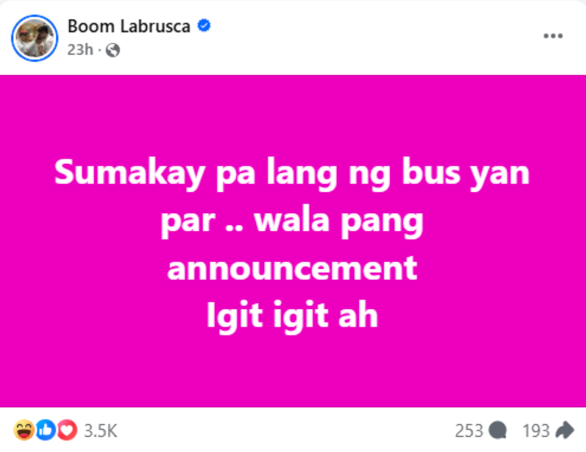 Sa isa pang Facebook post, "Sumakay pa lang ng bus yan par .. wala pang announcement Igit igit ah."
