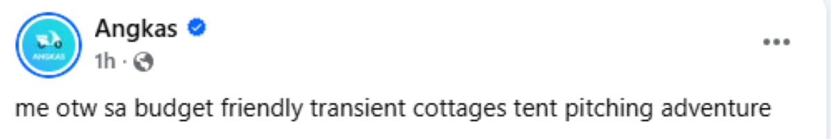 "me otw sa budget friendly transient cottages tent pitching adventure," mababasa sa caption ng kanilang meme-inspired advertisement.