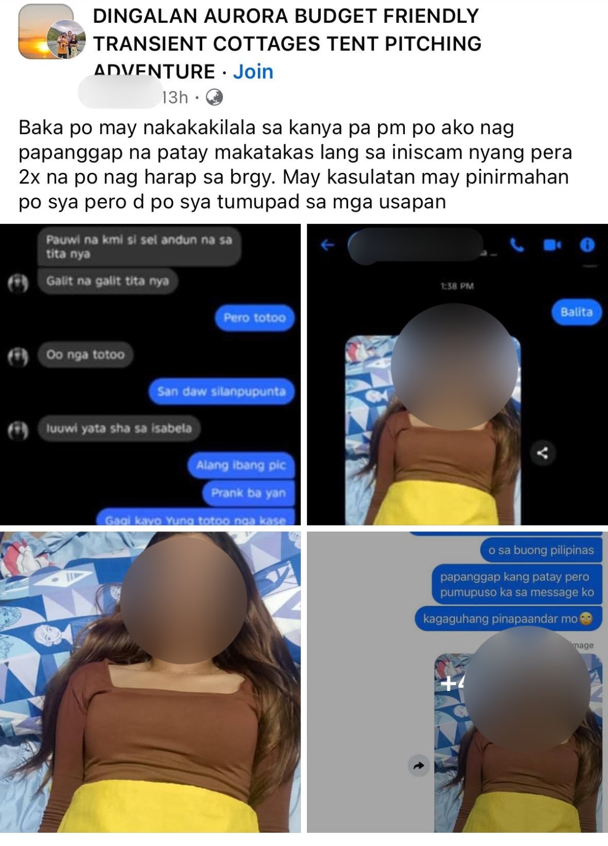 Mababasa sa post ng isang online group, "Baka po may nakakakilala sa kanya pa pm po ako nag papanggap na patay makatakass lang sa iniscam nyang pera 2x na po nag harap sa brgy. May kasulatan may pinirmahan po sya pero d po sya tumupad sa mga usapan."