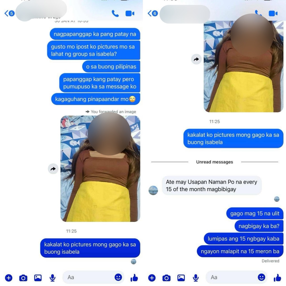 Sa ilang mensahe, makikita rin ang pagbabanta ng nagreklamo na ipapakalat ang mga larawan ng babae kung hindi ito tutupad sa obligasyon. Samantala, iginiit naman ng kabilang panig na may kasunduan silang pagbabayad sa itinakdang petsa.
