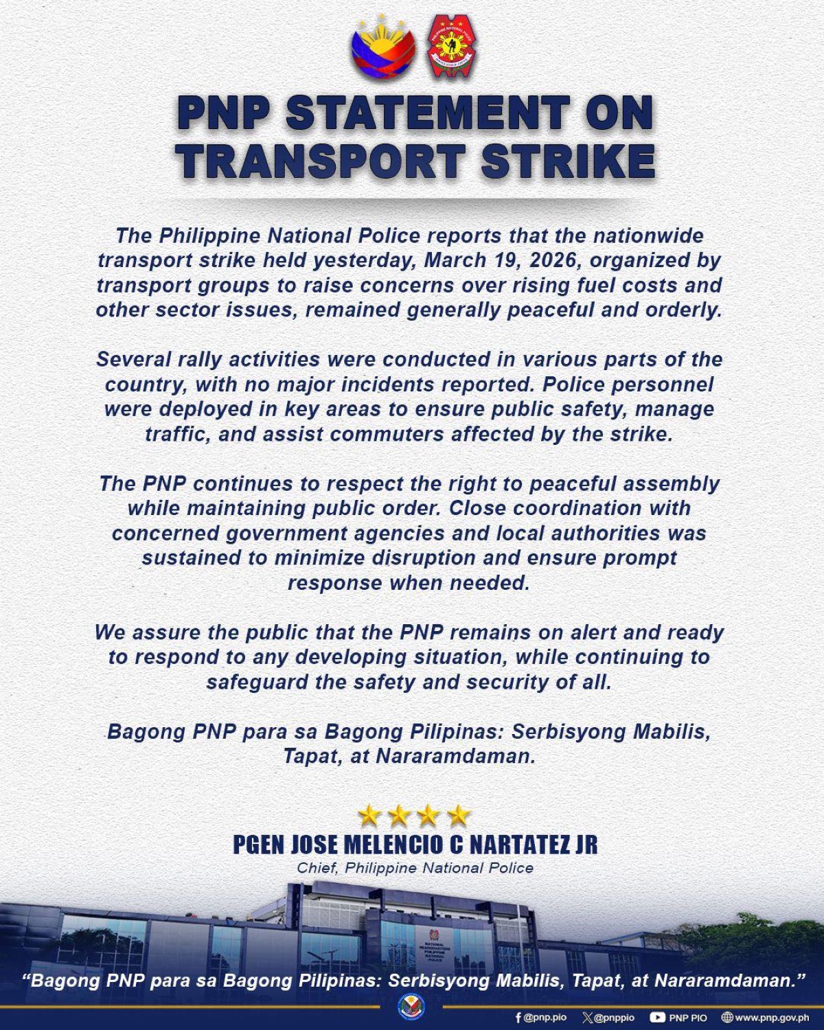 “The Philippine National Police reports that the nationwide transport strike held yesterday, March 19, 2026, organized by transport groups to raise concerns over rising fuel costs and other sector issues, remained generally peaceful and orderly,” saad ng PNP.