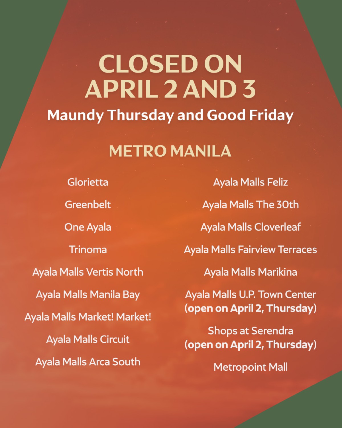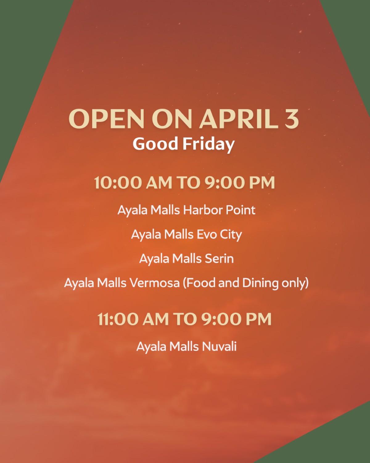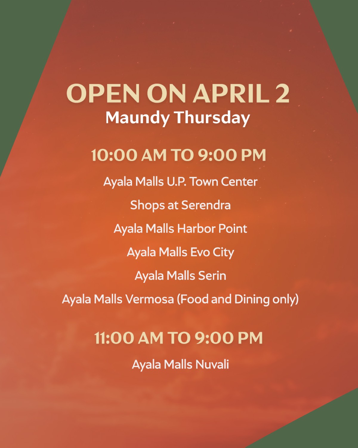 Ayon sa social media post ng Ayala Malls, ang kanilang mga establisyimentong bukas sa Abril 2 simula 10:00 AM hanggang 9:00 PM ay ang mga sumusunod: