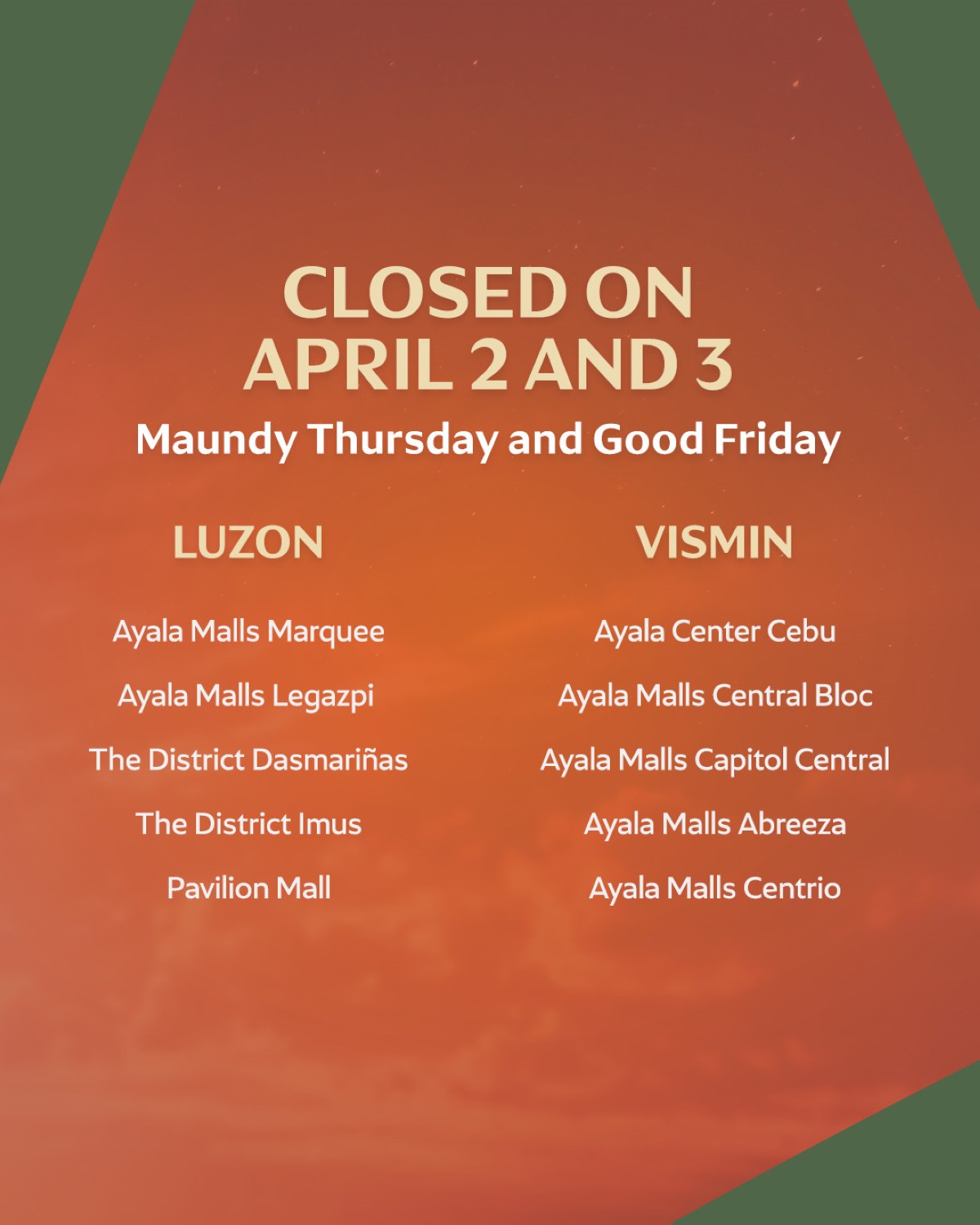 Marami naman ang magsasara sa Biyernes Santo, maliban sa Robinsons La Union, Robinsons Luisita, Robinsons Tagaytay, at Cybergate Bacolod.