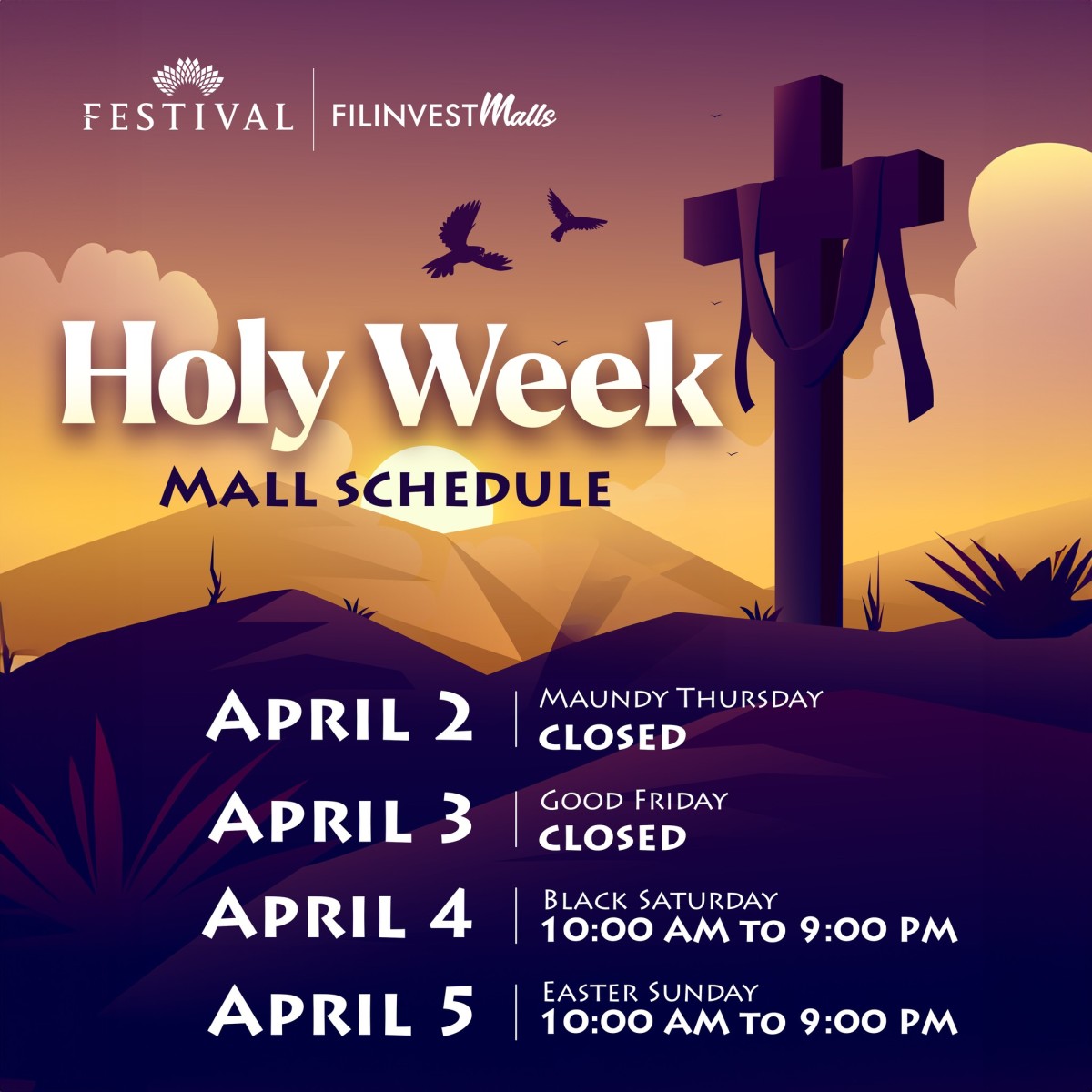 Dahil dito, narito ang schedule ng “adjusted mall hours” sa iba’t ibang lungsod sa bansa sa darating na Semana Santa: